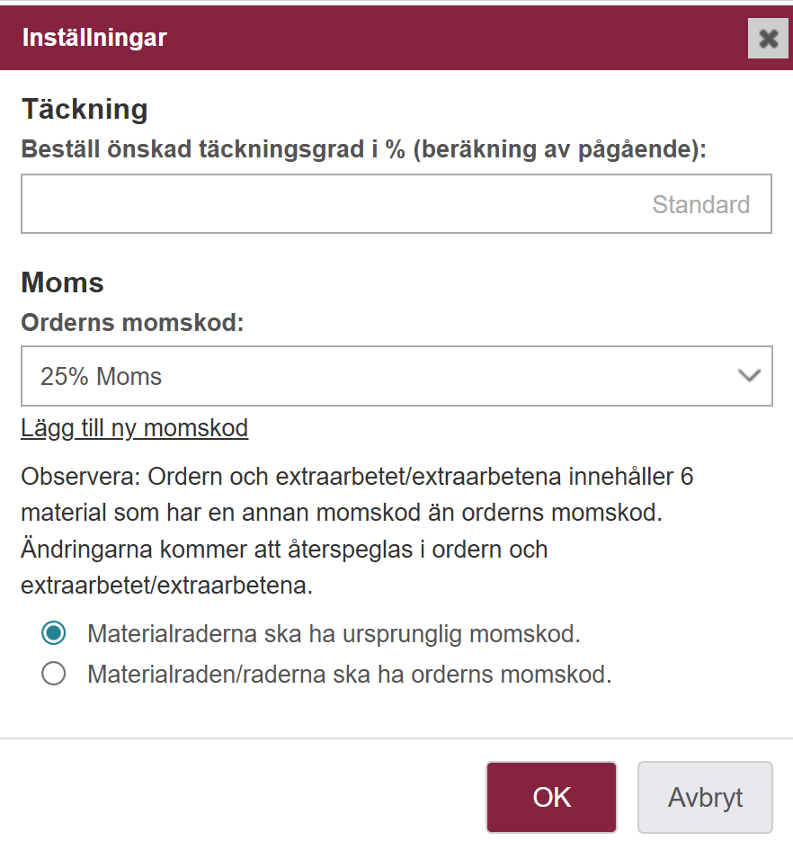 Om du väljer 'Materialraderna ska ha orderns momskod' ändras momsen på raderna så att den stämmer överens med orderns.