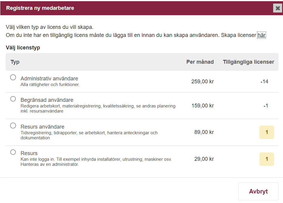 Om du inte har några tillgängliga licenser för den valda licenstypen, välj ‘Köp licens’. Då kommer du till ‘Abonnemangsöversikt’ där du kan köpa de licenser du behöver. Du kan ändra flera licenser samtidigt, till exempel köpa 2 begränsade användare och ta bort en resursanvändare samtidigt.
