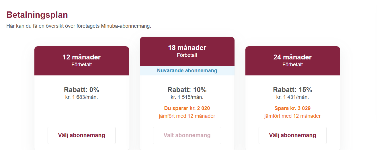 Det är viktigt för oss att du enkelt kan förstå priserna för ditt abonnemang i Minuba. Därför kan du själv se och ändra abonnemanget när du vill, så att det passar dina behov just nu.