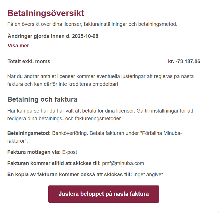 När du lägger till licenser i ditt Minuba-avtal skapas automatiskt en faktura som ligger klar för betalning.