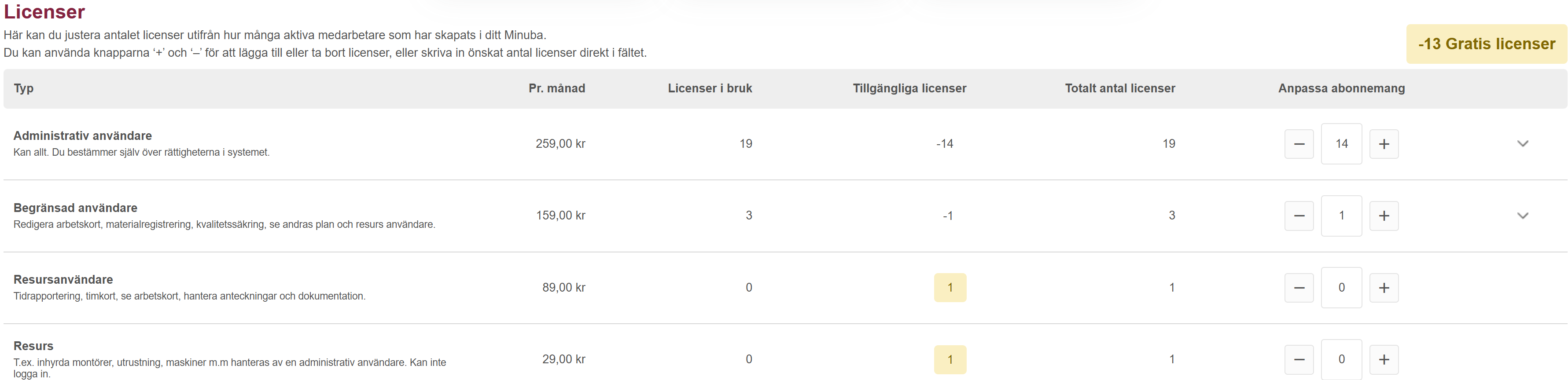 Det viktiga i denna översikt är att du anpassar dina licenser till antalet aktiva medarbetare som du har registrerat i ert Minuba. Det kommer att markeras om du har lediga licenser i bruk och vilka användartyper det gäller. Det är dessutom möjligt att expandera licenserna och se vilken användare som är kopplad till de olika licenstyperna.