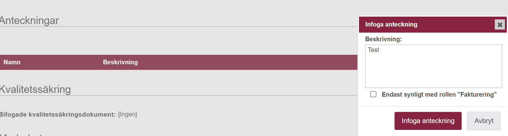 När du skriver en anteckning på ett extraarbete kan du välja att endast medarbetare med administrativa rättigheter (rollerna Administratör eller Fakturering) kan se anteckningen. När anteckningen är tillagd markeras denna typ av anteckning med ett litet öga och kan endast ses av medarbetare med rätt roll.