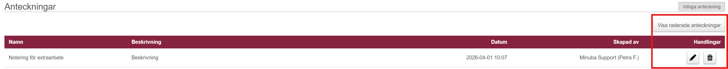 I översikten över dina anteckningar kan du se namn, beskrivning, datum samt vem som har skapat anteckningen. Du har också möjlighet att redigera och ta bort anteckningen. Du kan alltid visa raderade anteckningar igen genom att klicka på knappen ”Visa raderade anteckningar”.
