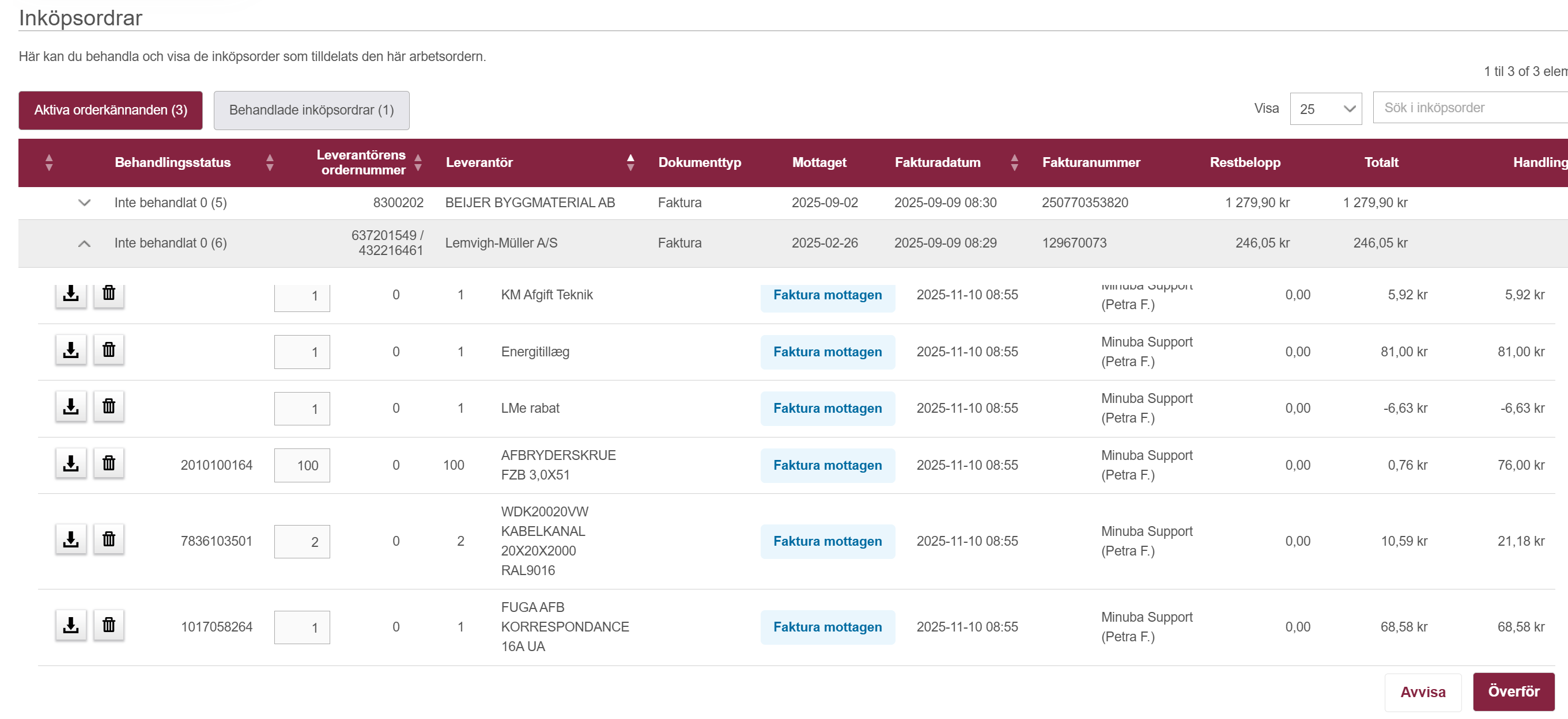 I inställningarna för varje grossist kan du välja att leverantörsfakturor som har mottagits från den valda grossisten automatiskt ska godkännas och överföras till relevanta arbetskort. För att de automatiskt ska överföras krävs det att fakturorna har den korrekta orderreferensen! Om Minuba inte kan hitta en order med den angivna referensen, måste fakturan behandlas manuellt. Om en korrekt order hittas, kommer alla rader från fakturan att läggas till i arbetskortet, och fakturan exporteras till ditt ekonomisystem. Det är inte möjligt att överföra fakturor automatiskt om man har valt "Jämför rader från EDI-faktura med befintliga rader på arbetskortet" i företagsinställningarna.