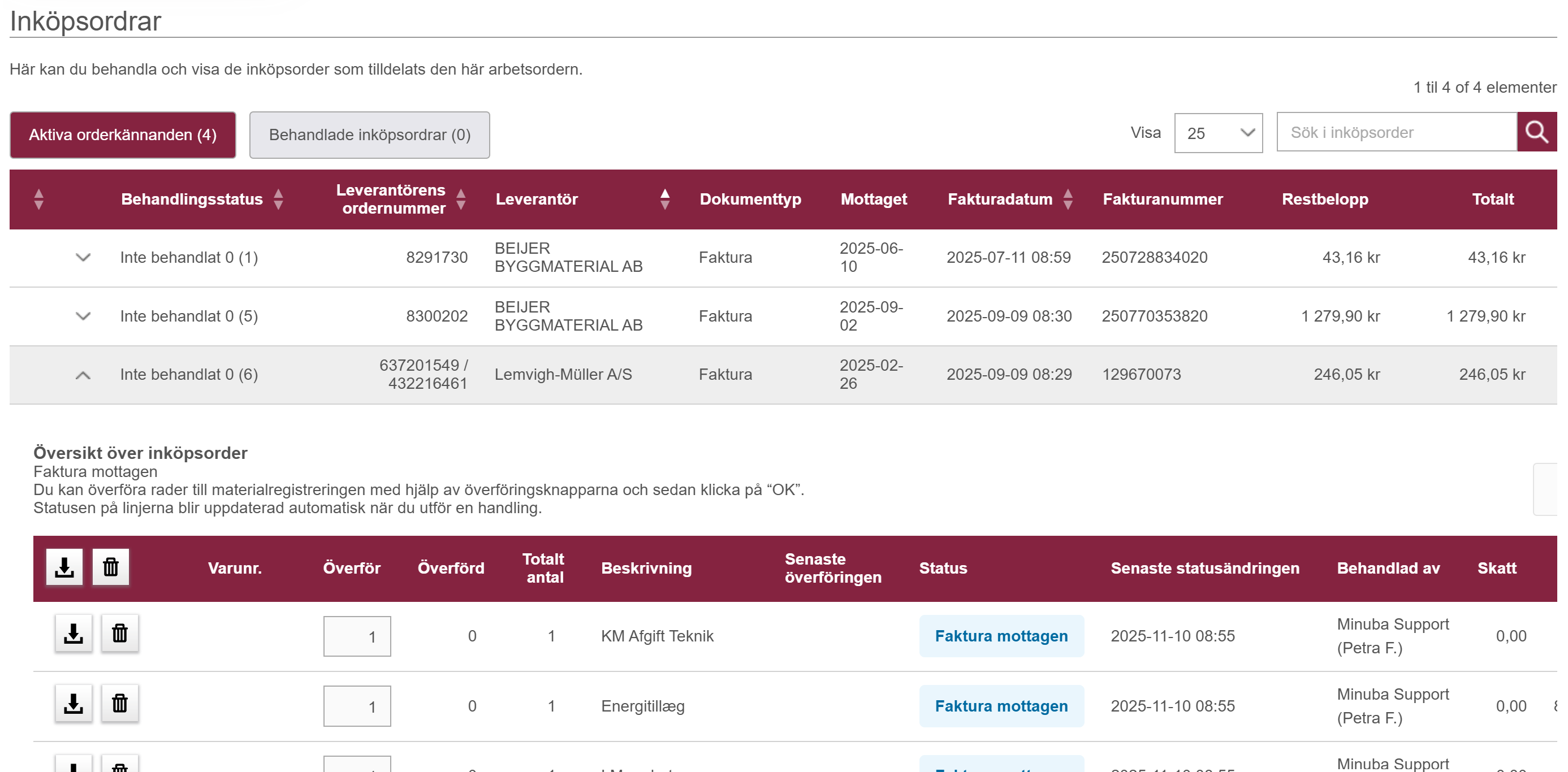 När grossisten därefter skickar en orderbekräftelse, följesedel eller faktura till Minuba, kommer beställningarna och de tillhörande raderna att visas i avsnittet 'Grossistinköp', där du kan överföra dem till materialregistreringen.