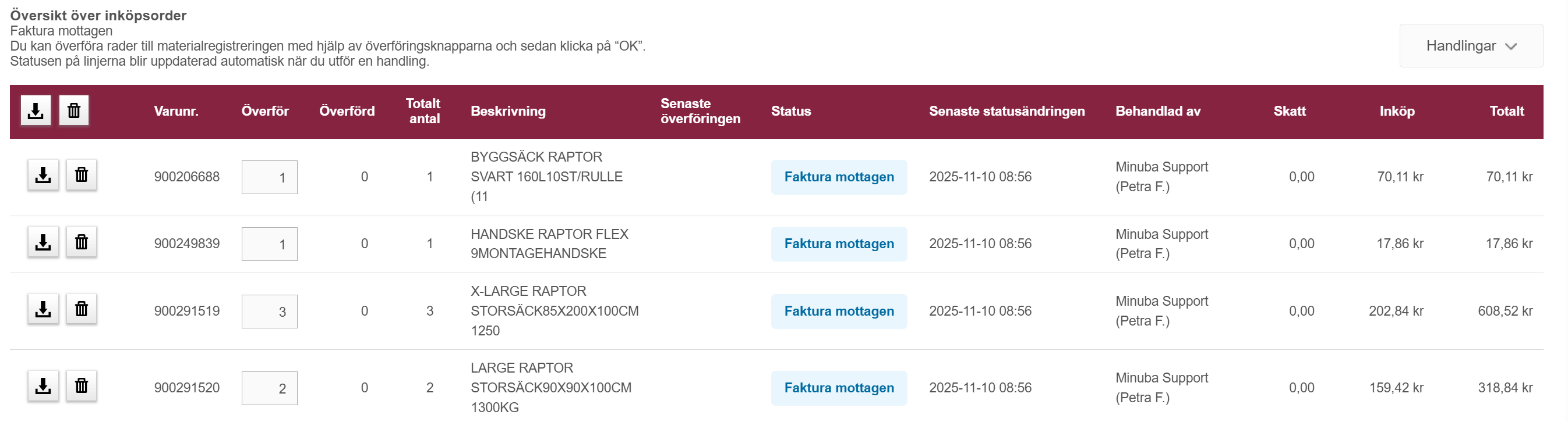 För att få en överblick över hur materialraderna har behandlats, när det har skett och av vem åtgärden har utförts, ska du titta på raderna på din grossistbeställning. Status ändras i takt med att du manuellt behandlar raderna.
