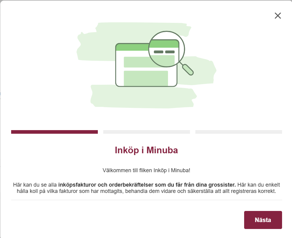 Första gången du besöker inköpsfliken möts du av en guide som visar de viktigaste funktionerna och förklarar hur du bäst använder Inköp i Minuba.