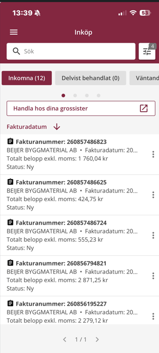I appen kan du se en överblick över alla dina inköpsfakturor, både de fakturor du har fått direkt från dina grossister och de fakturor du själv har laddat upp så att du snabbt kan se vilka fakturor som har behandlats och vilka som ännu inte är behandlade.