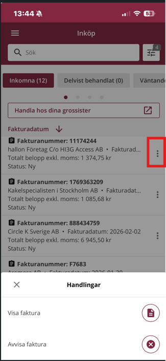 Du kan visa den enskilda fakturan genom att klicka på de tre prickarna till höger om fakturan i listan.