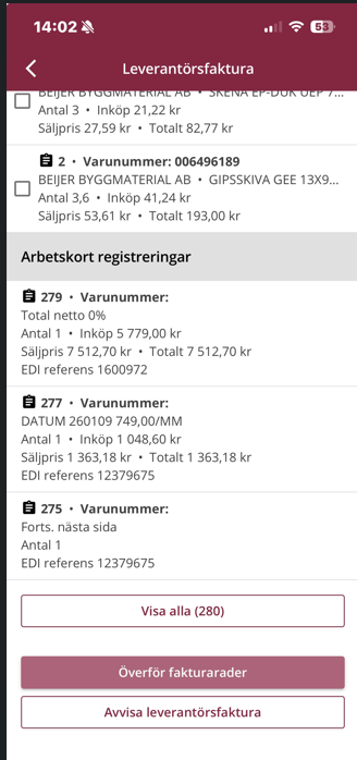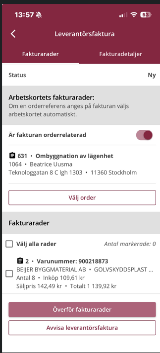 Härifrån kan du även flytta fakturaraderna till ett eller flera arbetskort, direkt i appen.
