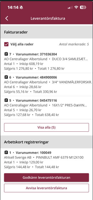 Observera att om du vill godkänna fakturan, behöver du först ha valt en order och sedan klicka på knappen 'Välj alla linjer' ovanför fakturaraderna.