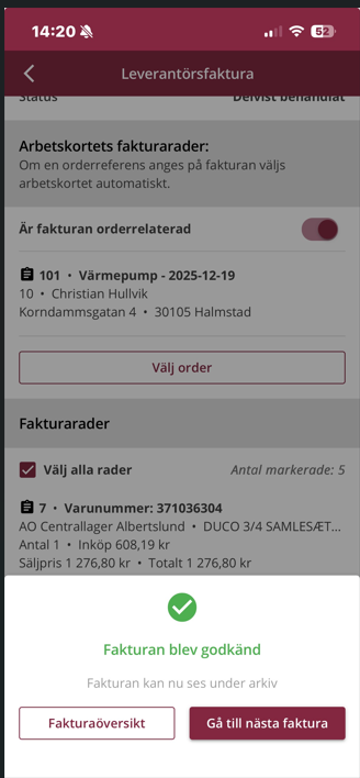 Längst ner på sidan kan du välja att godkänna eller avvisa fakturan, varefter du antingen kan gå till nästa faktura i listan, eller gå tillbaka till fakturaöversikten.
