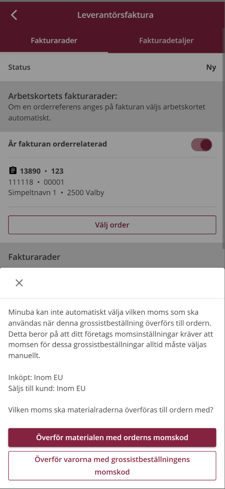 Observera att detta endast påverkar vilken moms materialraderna får på arbetskortet/kundens faktura samt vilken moms materialraderna exporteras med till bokföringssystemet. Momsen på materialraderna på själva inköpsfakturan ändras inte.