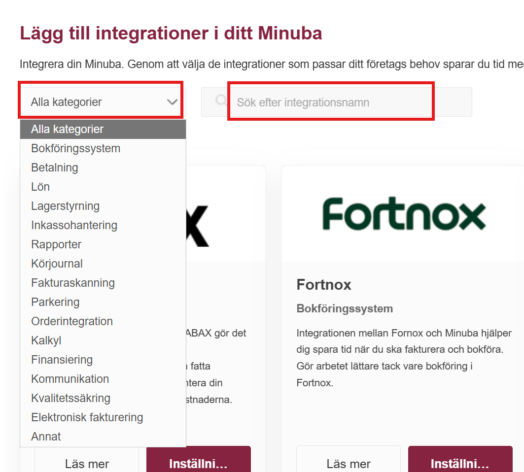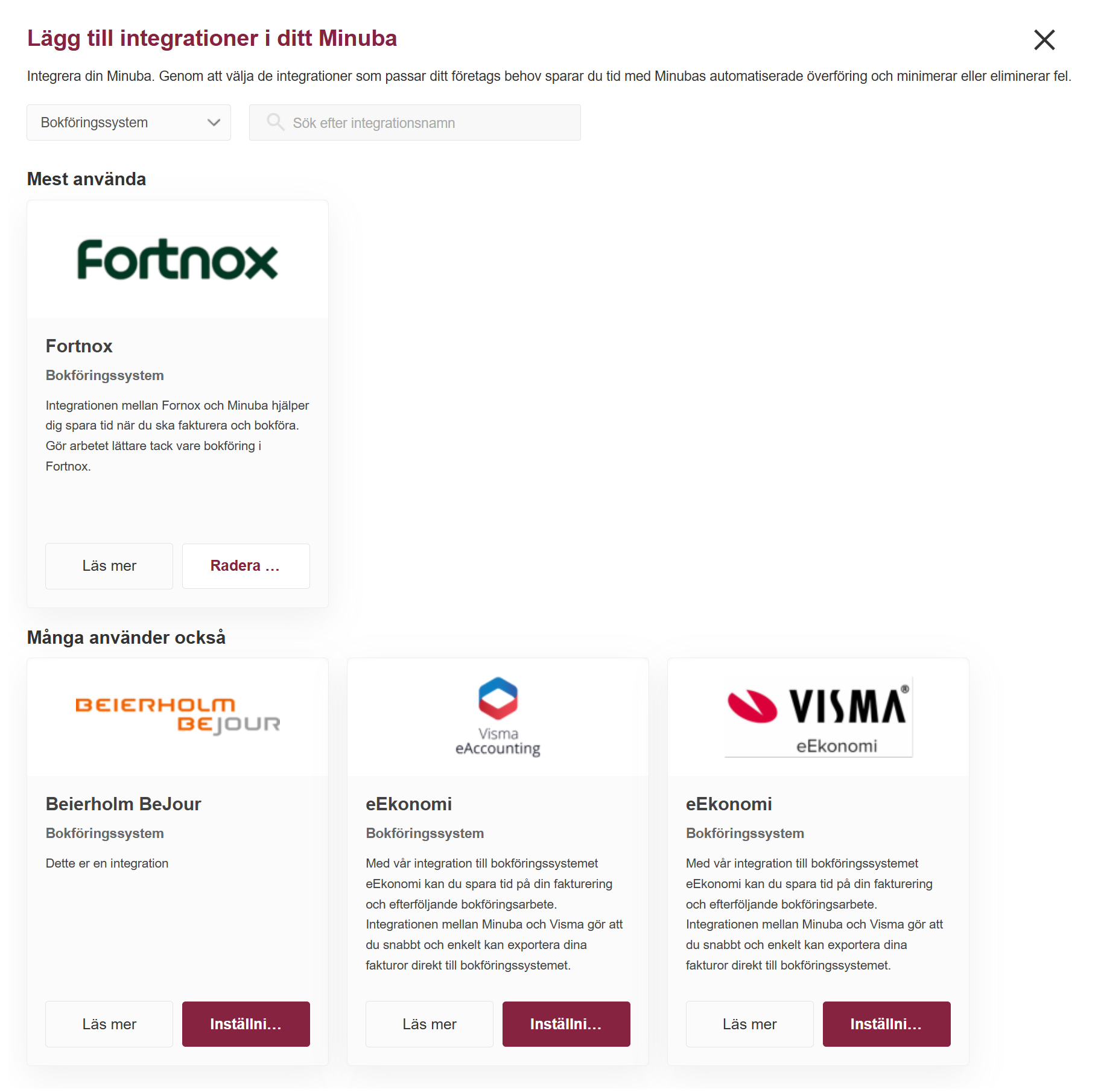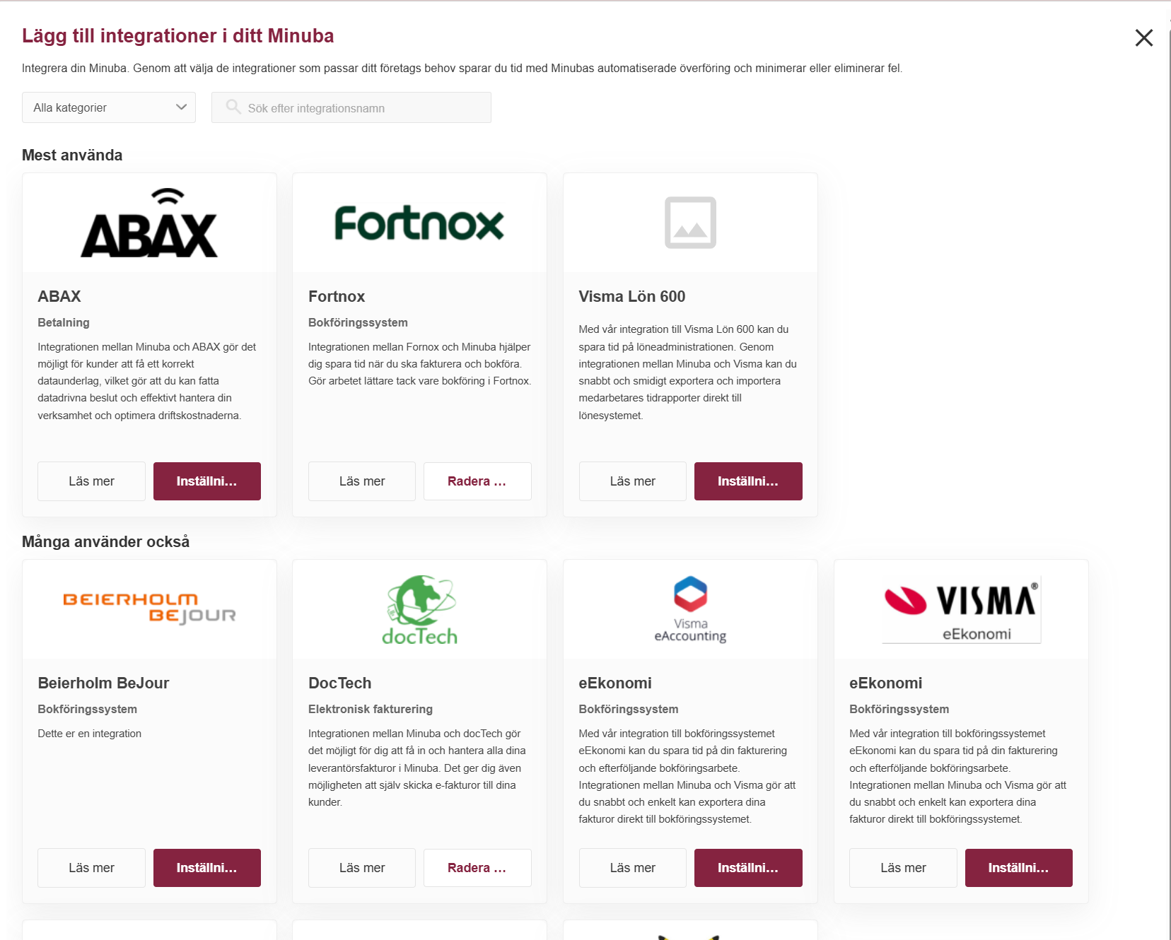På integrationssidan presenteras du också för utvalda integrationer i olika kategorier, som potentiellt kan vara relevanta för ditt företag. Dessa integrationer är ännu inte aktiverade, men är handplockade av Minuba utifrån vad vi bedömer kan vara till hjälp i din vardag.