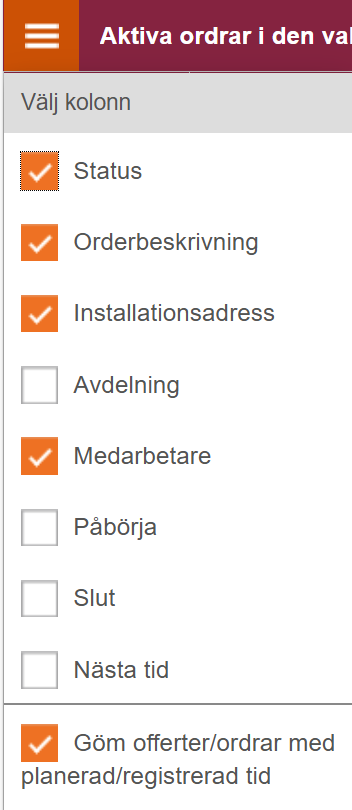 Nu kommer du endast att se aktiva order inom den tidsperiod du har valt, som du ännu inte har planerat eller registrerat tid på.