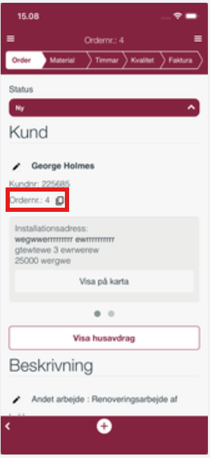- Lägg till anteckningar, material, timmar och tilläggsarbete på en order